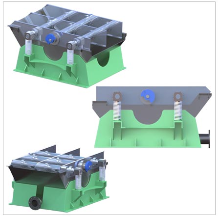 The vibrating screen consists of a M.S. fabricated screening though with S.S. 304 screen plate or Nylon Screen plate having 3mm diameter holes. A shaft supported on two heavy duty bearings in grease lubricated CI bearing housing is fitted to the centre of the screening trough. Two in-balanced weights are provided at both ends of the shaft for attaining vibration. The screening trough is freely carried on 4 nos. Coiled springs which rests on a M.S. fabricated bottom vat. The bottom vat is provided with adjustable partition for maintaining the level of the accepted pulp. A nozzle is provided on the bottom vat for the collection of accepted pulp. A shower pipe is also provided on the screening through for washing off good fibres which adhere to the rejects. The bottom vat is provided with hand holes for cleaning purpose. The Vibrating Screen is driven by a separately mounted electric motor by coupling directly to the screen through a flexible shaft.